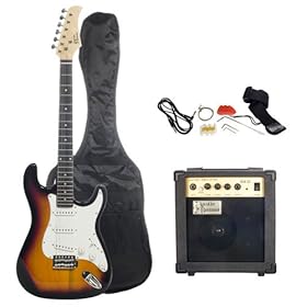 This Complete package includes the SX RST guitar - Features of the guitar are: RST Guitar: Perfect for many musical styles including rock, jazz, blues and Christian Dual cutaway solid Alder body allows access to the highest frets Die Chrome Tuners The body is contoured for hours of comfortable play Three single coil pickups, one volume and two tone controls plus a five way pickup selector switch create all of today?s great sounds Vintage fulcrum bridge with six adjustable saddles Truss rod adjustable Maple neck Rosewood fretboard, 22 jumbo frets Amp Features: 10 Watts of power through a specially design 5.5" speaker Master Volume Control Two Band EQ with Bass and Treble controls Headphone jack for quiet practice Weight of amp: 6.5lbs Overall dimentions: 9 3/4" wide x 10 5/8" high x 5" deep Other items: Guitar Tuner to help get your guitar in tune 10' instrument cable to connect your guitar to your amp EB400 Guitar Bag to protect your guitar when your not playing A Guitar Strap and Picks